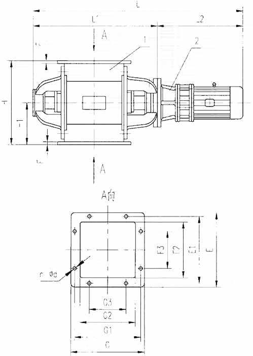 GY型剛性葉輪式給料機是一種定量給料設備。配用BLY系列擺線針輪減速機,它通過減速機出軸直接與主軸剛性連接,從而帶動主軸和葉輪旋轉。葉輪上裝有若干個葉輪片,其上裝有橡膠密封片,用壓板壓緊,密封片緊貼外殼內壁。當電機旋轉時,主軸、葉輪同時旋轉,物料從上部料倉通過進料口進入葉輪槽內,旋轉的葉輪把物料帶到出料口喂送出去。本機屬于輔助性輸送設備。